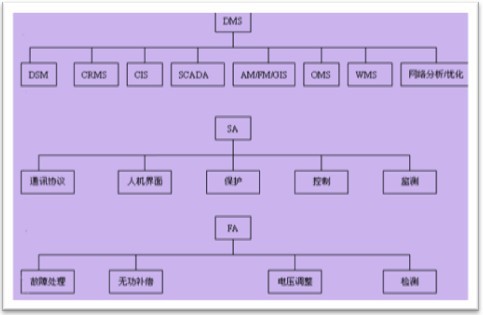 在国际上,根据配电自动化系统的基本要求,一般可以将它分成DMS、SA、FA、DSM四个层面,如下图3所示。